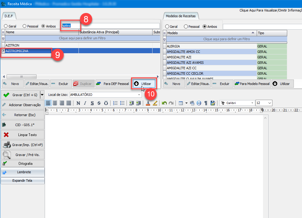 8) Ao abrir a tela de criação de receitas, posicione o cursor do mouse no campo de pesquisa e inicie a digitação do medicamento desejado. O sistema irá filtrar a lista de opções conforme a digitação acontece.