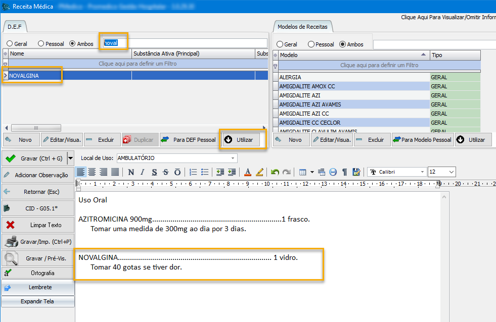 | Criando uma Receita Médica para um paciente de Pronto Socorro, a partir da Tela de "Pronto Atendimento". |