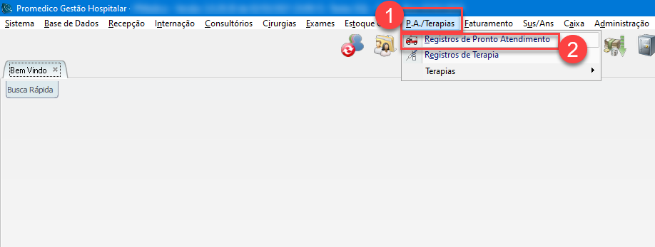 1) Para acessar a Tela de Pronto Atendimento, após efetuar login no sistema, clique no menu "P.A./Terapias".