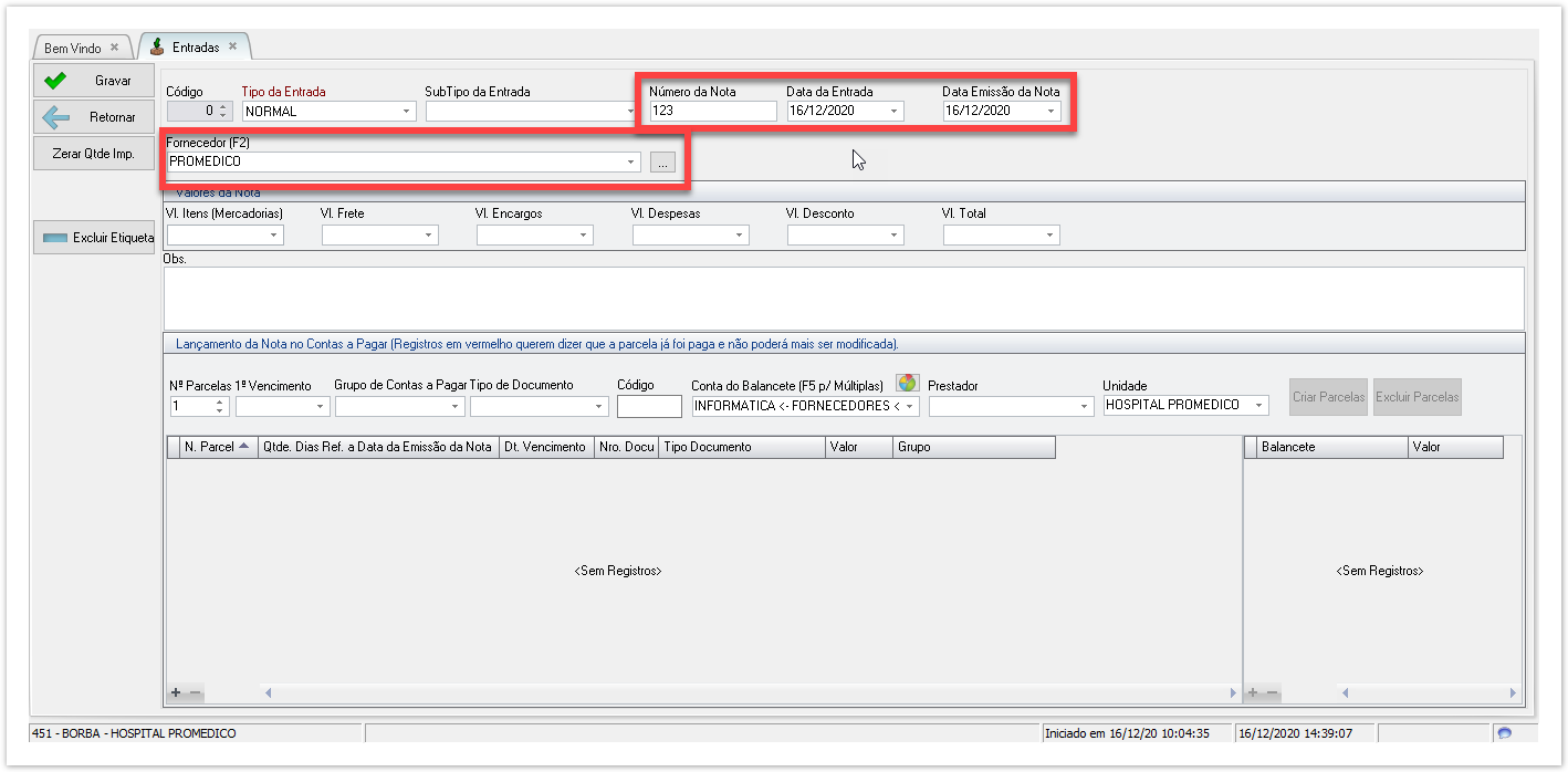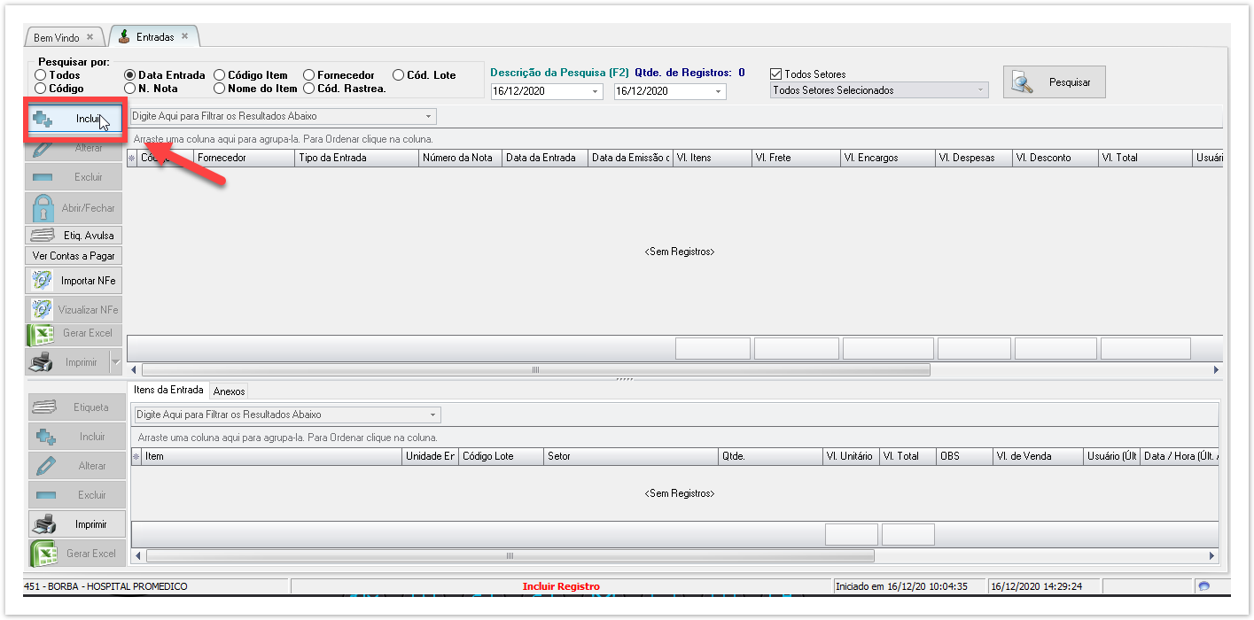 6. Após incluir as informações da nota fiscal e clicar em GRAVAR o sistema irá automaticamente para a tela de digitação de ITENS da Entrada.