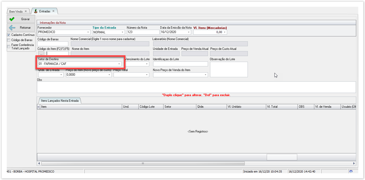 Na tela itens a primeira opção que merece atenção é o campo que informa em qual SETOR DE ESTOQUE o item irá fazer a entrada.