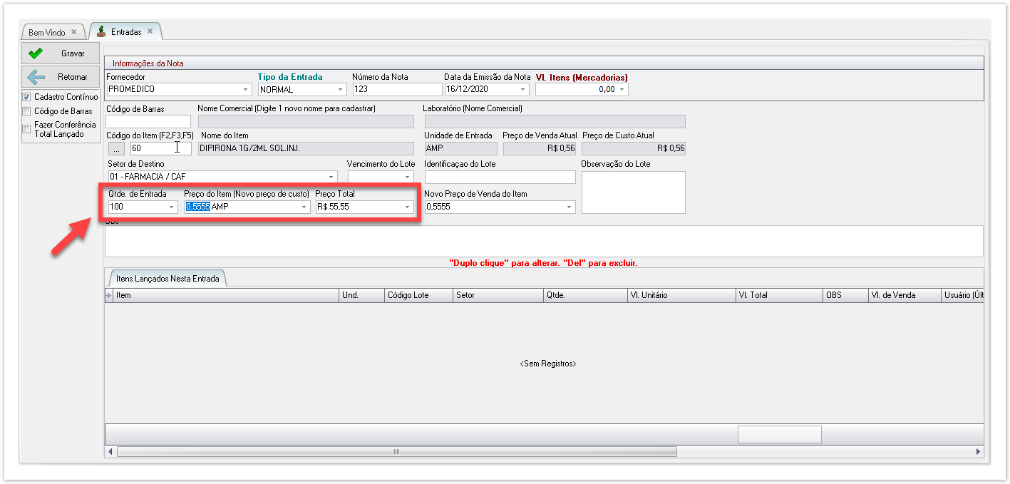 8. Após definir o ITEM informar também a QTD DE ENTRADA e PREÇO UNITÁRIO do item.
