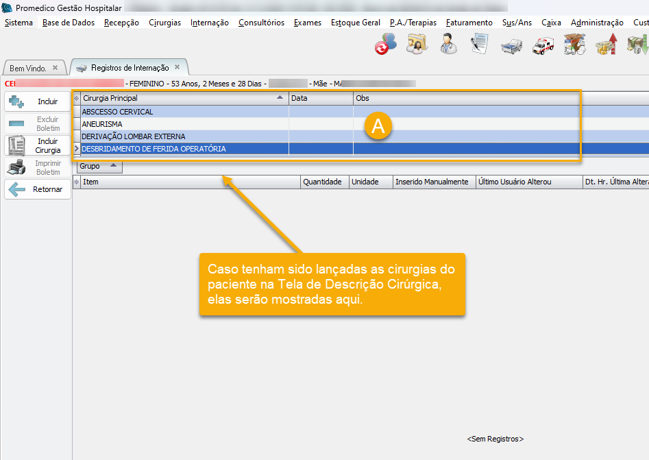 Caso o paciente já possua registros de cirurgias cadastrados na Tela de Descrição Cirúrgica, estes estarão listados no grid de registros de cirurgias, conforme ilustrado abaixo no quadro "A".