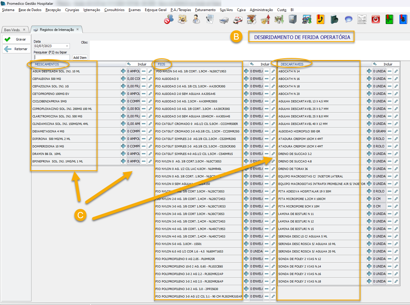 Note também que, no alto da tela, o sistema mostra o nome da cirurgia que foi selecionada no passo (4), conforme destacado pela letra "B".
