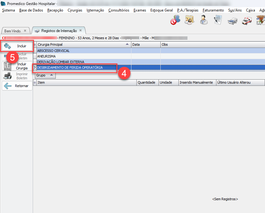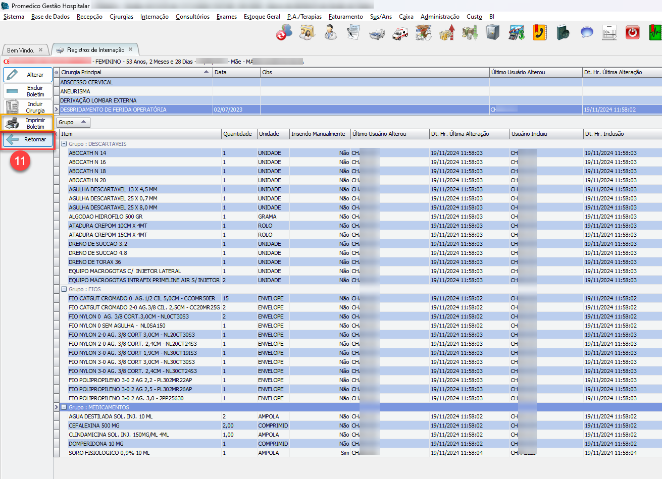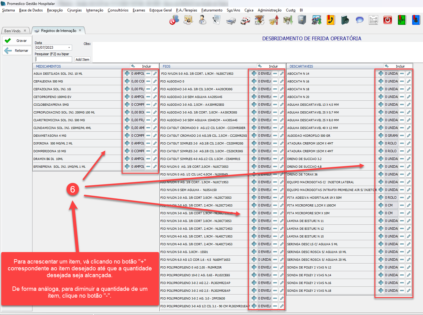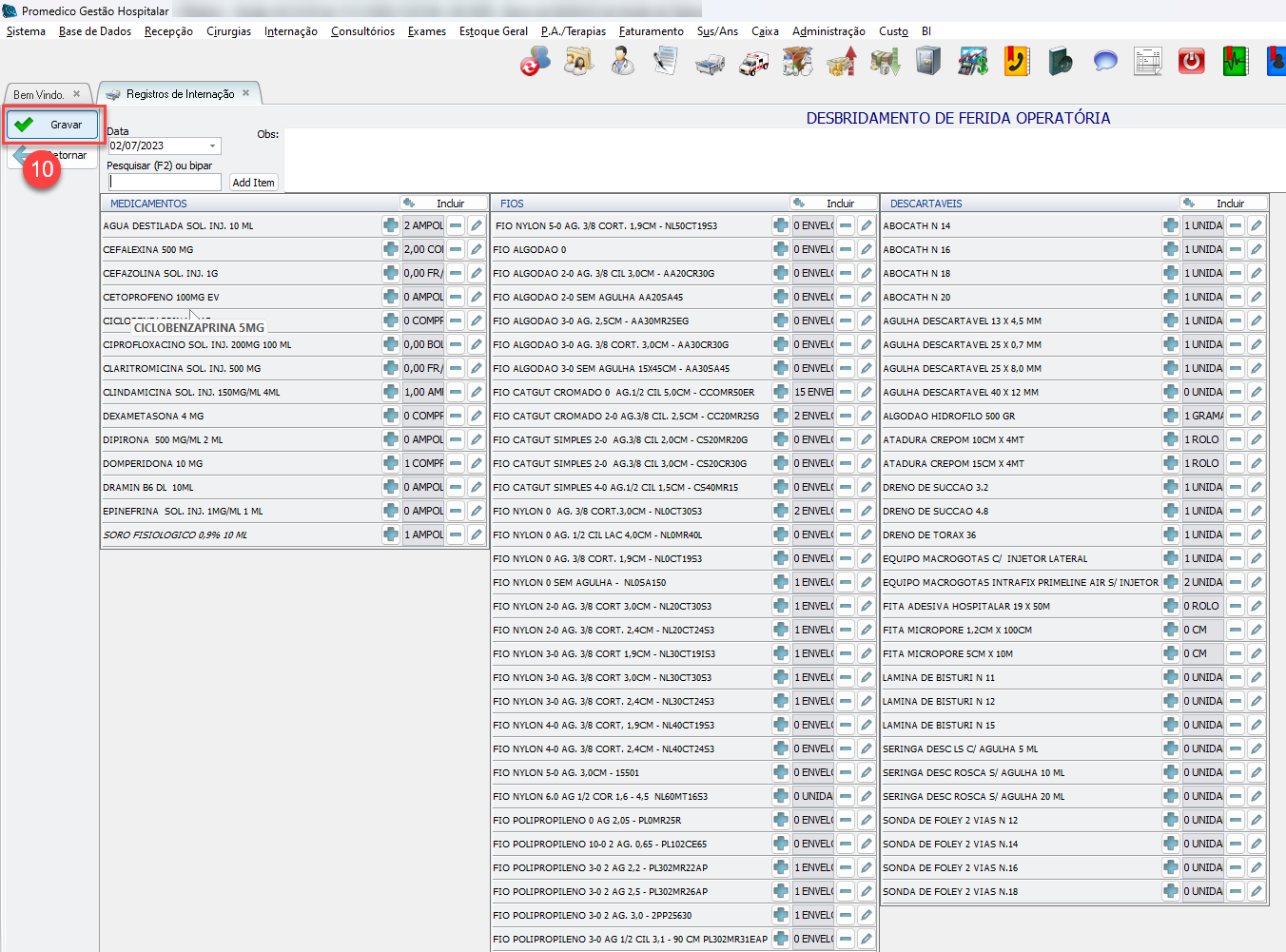 10) Repita os passos (6) a (9) até que todos os itens desejados estejam devidamente informados no Boletim, em seguida, clique no botão "Gravar" para salvar os dados e retornar para a tela principal de Boletim Cirúrgico.
