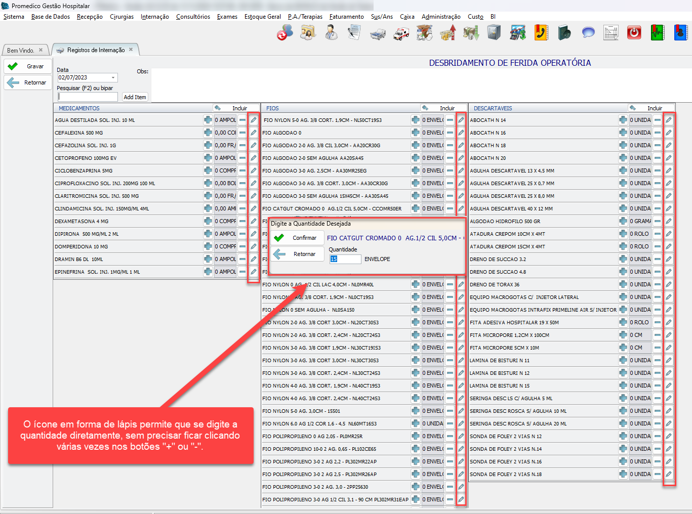 O ícone em forma de "lápis" permite que se digite uma quantidade diretamente, sem precisar ficar clicando várias vezes nos ícones mencionados acima.