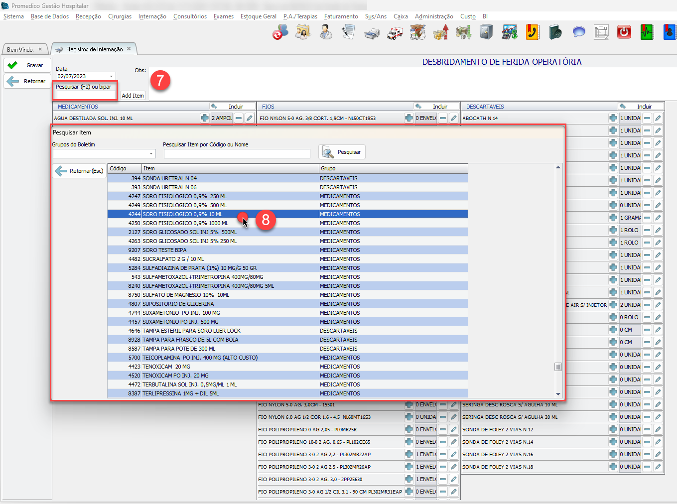 7) Caso não encontre algum item na lista pré-carregada pelo sistema, você pode incluir um item avulso (desde que o mesmo exista no cadastro de mat/med do sistema) clicando 1x dentro do campo "Pesquisar (F2) ou Bipar", e em seguida pressionando a tecla "F2" no teclado.