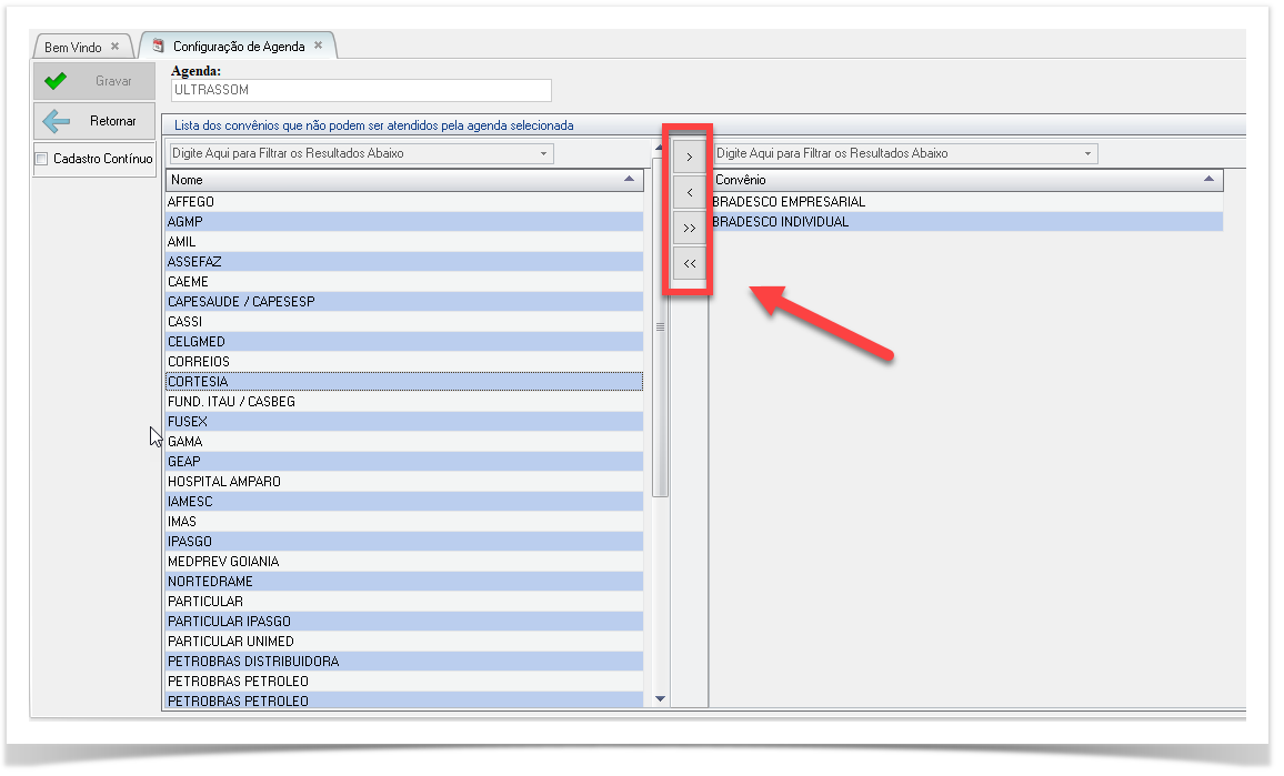 Da forma que a regra acima foi criada a agenda irá atender todos os convênios (que estão do lado esquerdo), exceto os convênios BRADESCO (que estão do lado direito).