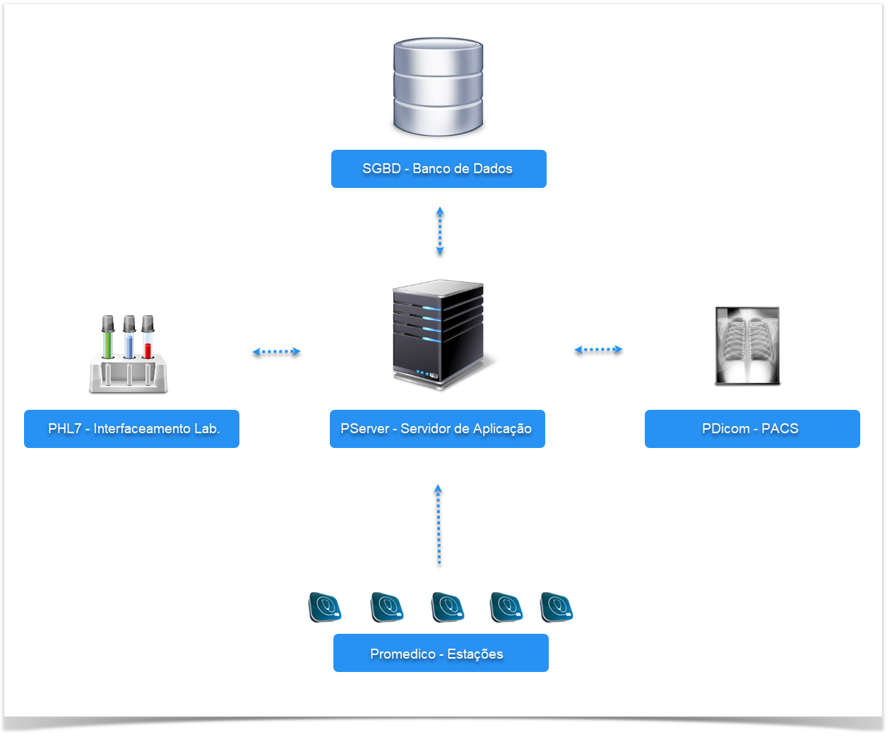 O Promedico é instalado nas estações e toda comunicação é feita com o Pserver (servidor de aplicação) de forma criptografada, compactada e segura, não acessando diretamente o banco de dados.