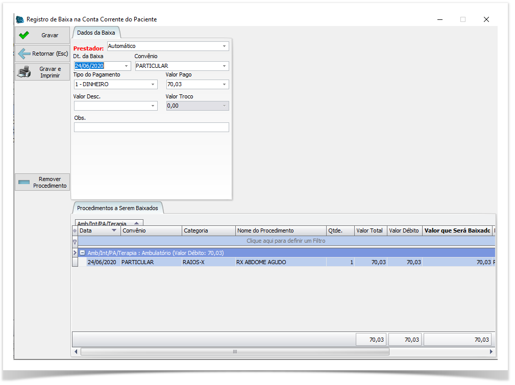 1. Ao clicar na opção Conta Corrente e depois de selecionar os procedimentos a serem pagos e clicar na opção Baixar Selecionados o sistema irá abrir a seguinte tela: