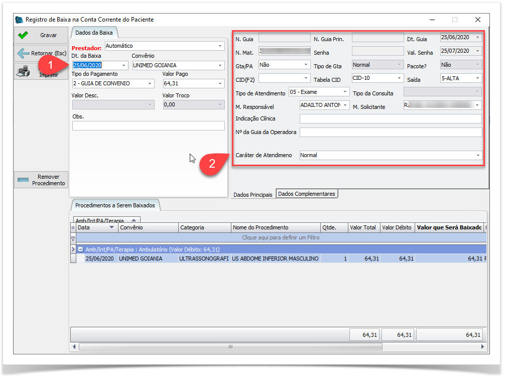 1. Ao clicar na opção Conta Corrente e depois de selecionar os procedimentos a serem baixados deve-se clicar na opção Baixar Selecionados o sistema irá abrir a seguinte tela: