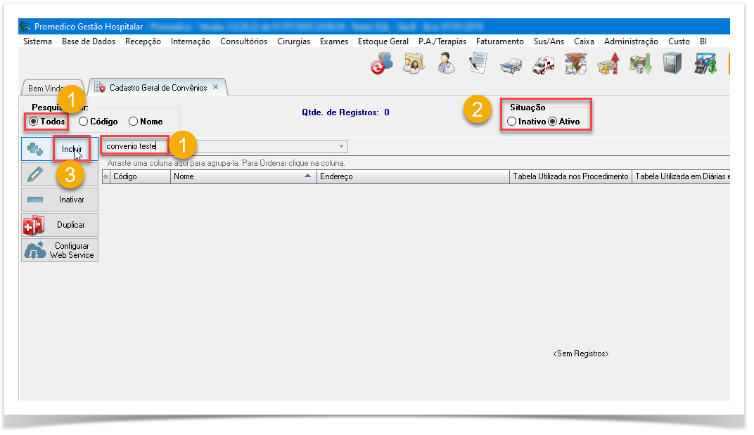 2. Lembre-se de alternar entre as opções "Ativo" e "Inativo" para se certificar de que o convênio realmente ainda não possui um cadastro.